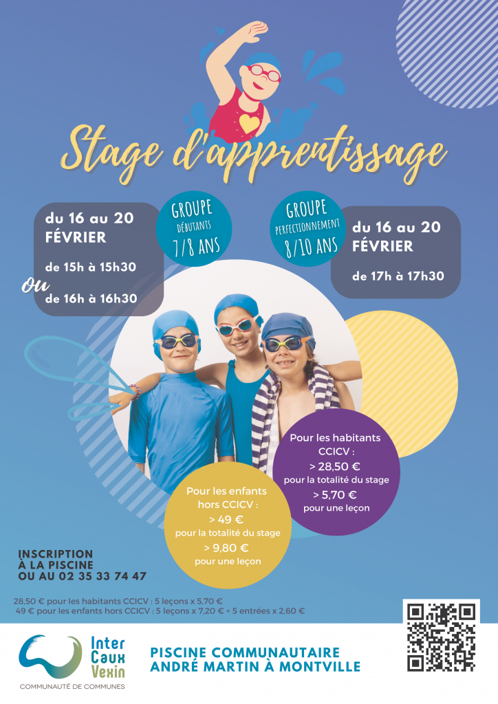 La communauté de commune propose un stage d’apprentissage de la natation pour enfant du 16 au 20 Février prochain à la piscine de Montville. Renseignements et inscription en scannant le QR code ci-dessous